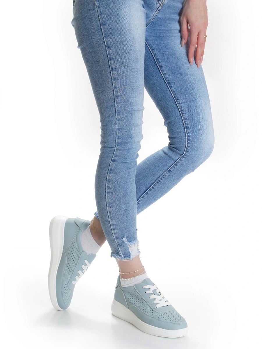 Летние женские кроссовки выполненные полностью из из натуральной кожи идеально подойдут для активного отдыха и городских прогулок. Высокий комфорт обеспечивает мягкая натуральная кожаная подкладка и стелька. Легкость ухода, стиль голубого оттенка и платформа придают элегантности. Стильные и надежные – ваш идеальный спутник весной и летом!