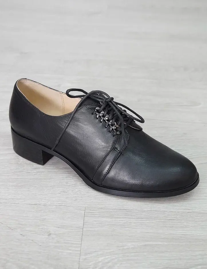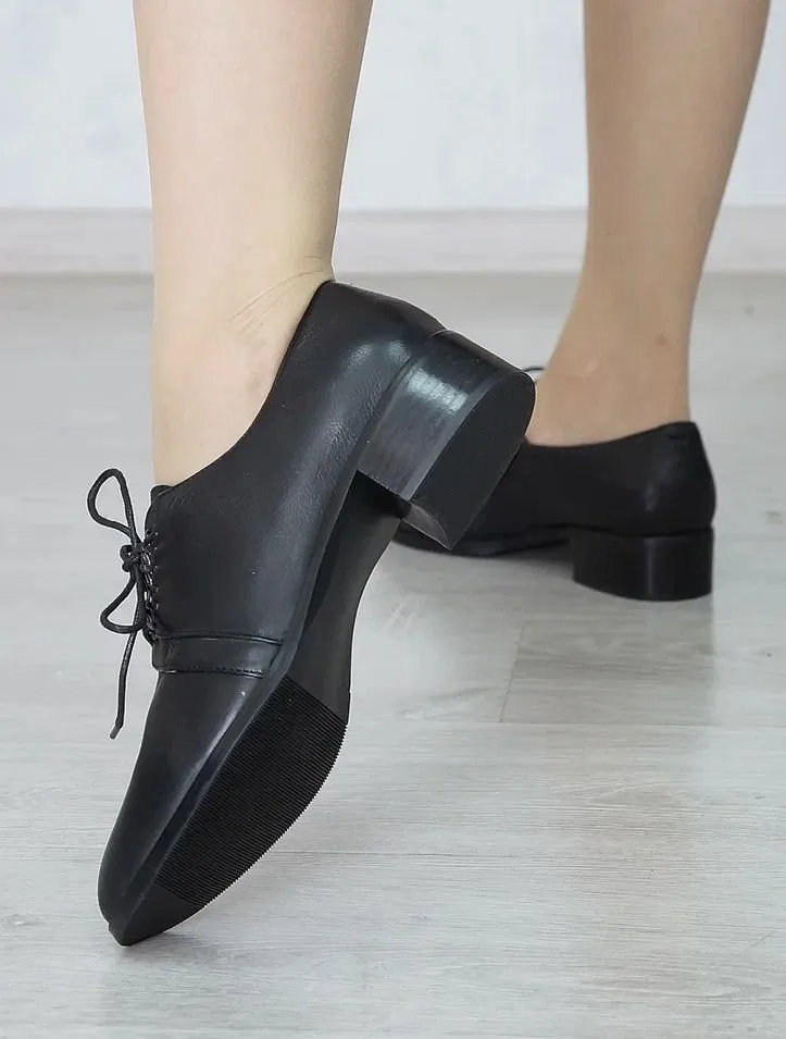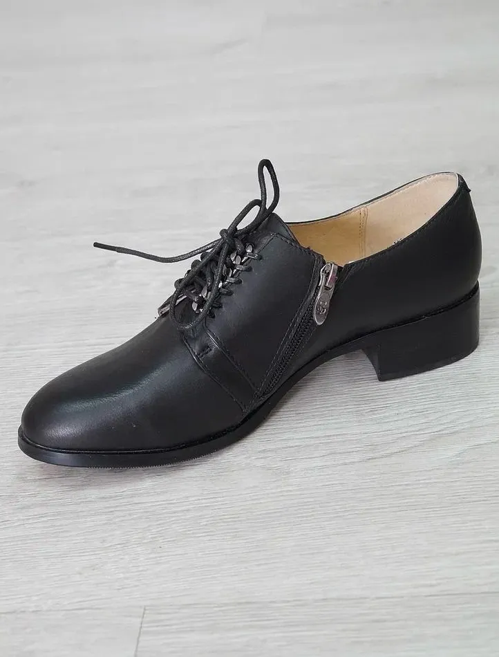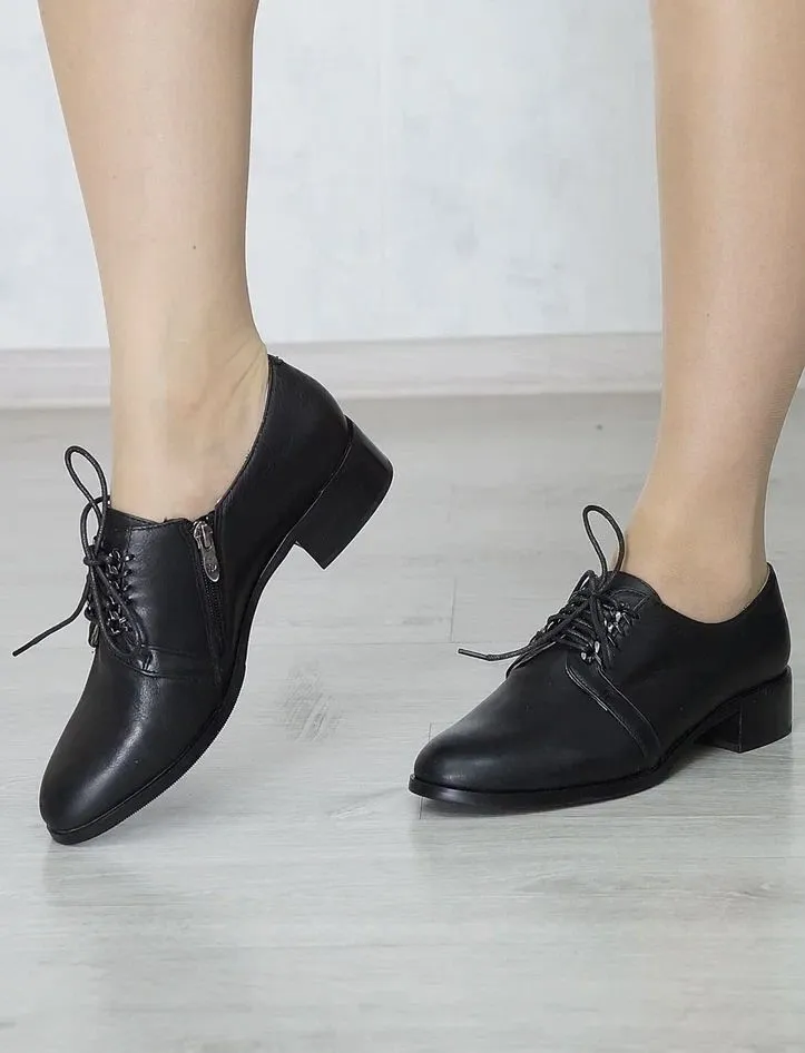 Женские туфли на низком каблуке - это актуальная классика. Модель представлена в черном цвете полностью из натуральной кожи. Туфли женские отлично впишутся в гардероб и гармонично дополнят любой Ваш образ. Удобная колодка и устойчивый каблук поддерживают ногу в комфортном положении в течение всего дня.