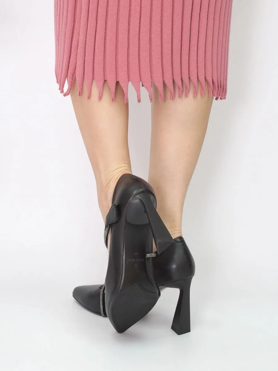 Изделие выполнено в классическом черном цвете, что делает его универсальным вариантом, подходящим к любому наряду. Вы можете сочетать их с платьем, юбкой или брюками, создавая разнообразные образы для работы или выхода в свет. Высокий каблук придаёт изящества, визуально удлиняя ноги и придавая Вам уверенности в каждом шаге.