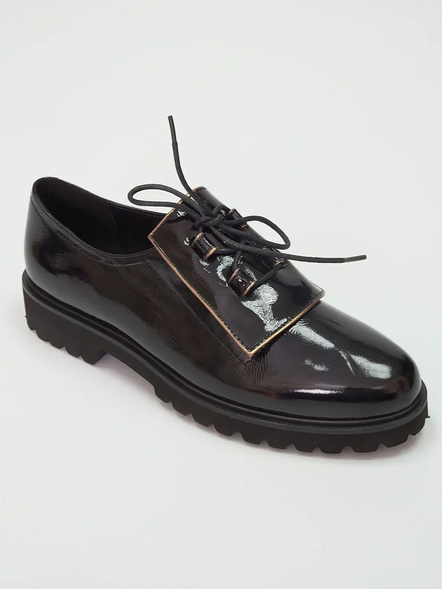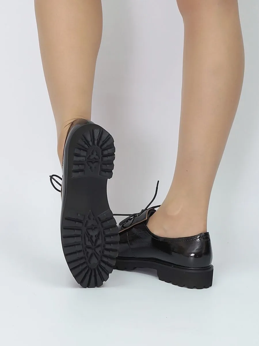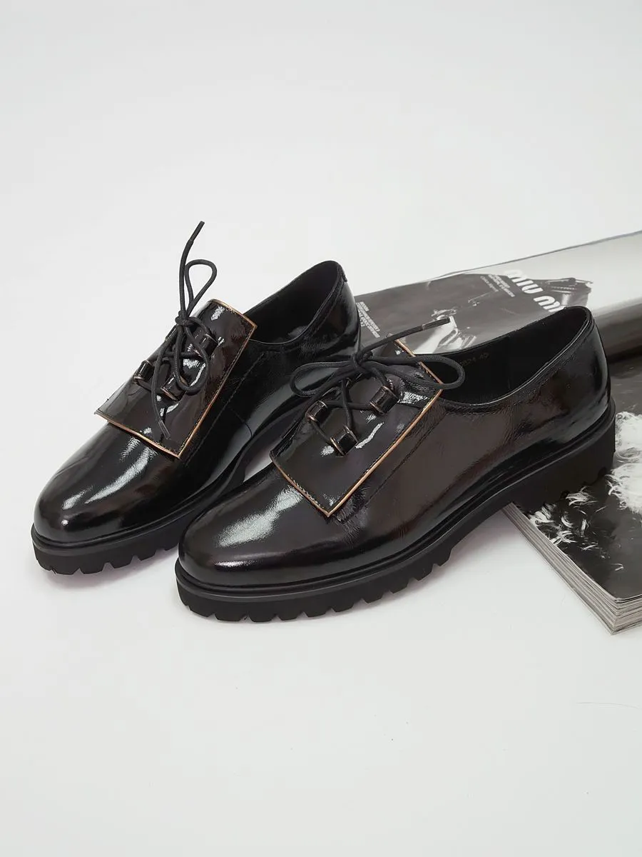 Туфли женские на шнурках созданы с учетом современных модных тенденций и потребностей активных женщин. Женские туфли на небольшом каблуке и легкой платформе обеспечат Вам удобство и комфорт в любой ситуации, а качественные материалы гарантируют долговечность и износостойкость. Модель представлена в черном цвете с верхом из натуральной лакированной кожи.