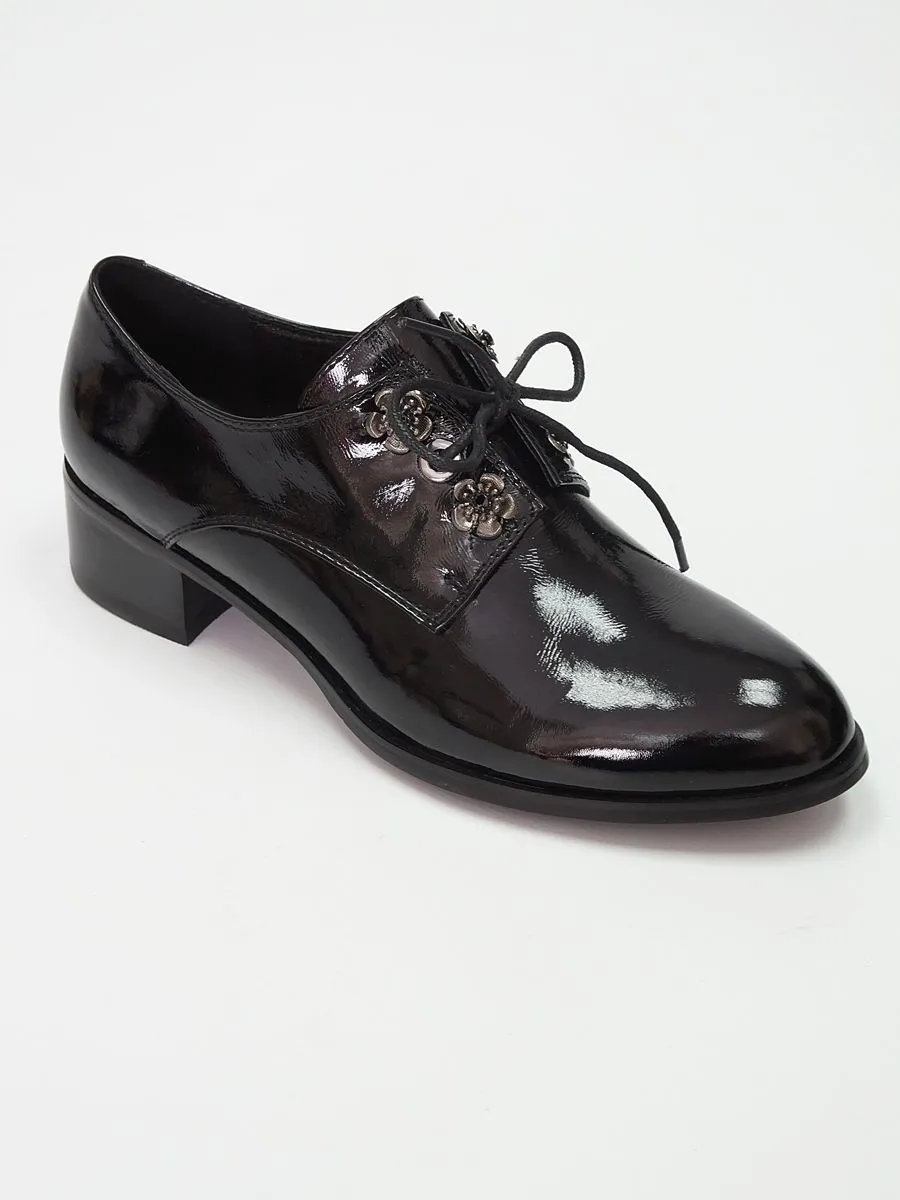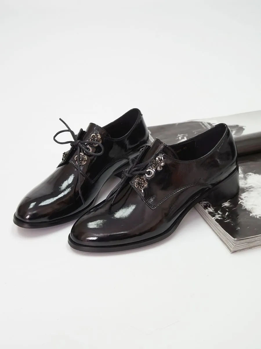 Туфли женские демисезонные на низком каблуке уже давно являются классическим атрибутом современного образа. Модель представлена в черном цвете с верхом из натуральной лакированной кожи. Внутренний материал и стелька изготовлены из натуральной кожи. Они идеально вписываются как в офисный, так и в повседневный и школьный стили.